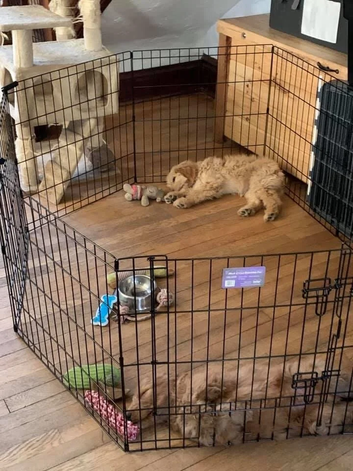 Some people look at this and say, “poor puppies, locked up in a pen!” But let’s have some real talk. I’m spring cleaning (a couple of months late, yes, I’m aware) and I need the dogs to entertain themselves for a while, as will most pet owners at some point. As a puppy trainer, part of my job is making sure these little ones can hang out comfortably and without panicking. It simply makes for a happier, more content dog—and owner!!! This nice little x-pen also helps us along in the potty training process. We start off in the crate or pen, then one room, then a couple of rooms, etc, until the puppy knows we don’t relieve ourselves in the house. Lastly, when the puppies are in this pen, they are safe! They can play or sleep or hang out and chew on one of the many toys and puppy safe chewies they have. Just as you would not turn your one-year-old loose with free reign in your house, neither should you let a puppy—who, btw, explores the world with his mouth—freely wander your home before he or she is ready. This is THE NUMBER ONE CAUSE of potty training and destruction problems. Too much freedom too soon. Remember—crawl before you walk! And keep those puppies safe!!